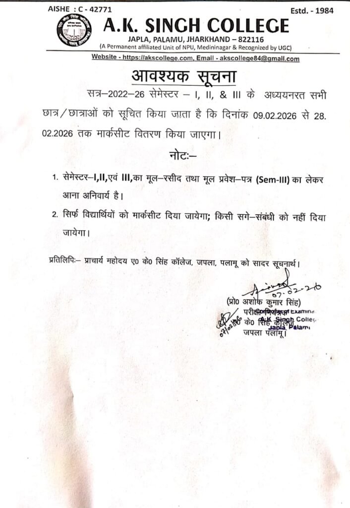 अंक पत्र संबंधी Post author:A K Singh College, Japla Post published:February 7, 2026 Post category:Uncategorized Post comments:0 Comments Share this: Click to share on Facebook (Opens in new window) Facebook Click to share on X (Opens in new window) X Like this:Like Loading... You Might Also Like क्रिकेट प्रतियोगिता October 11, 2025 Admission Notice, session-(2021-24) Semester-5, May 9, 2024 NOTICE FOR PRACTICAL EXAMINATION SUBJECT-CHEMISTRY(2018-21) January 18, 2022 Leave a Reply Cancel replyCommentEnter your name or username to comment Enter your email address to comment Enter your website URL (optional) Save my name, email, and website in this browser for the next time I comment. Notify me of follow-up comments by email. Notify me of new posts by email. Δ