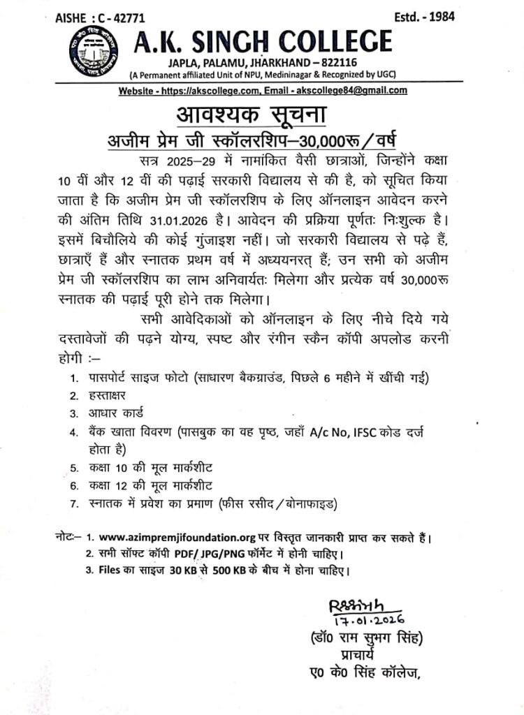 अजीम प्रेम जी स्कॉलरशिप संबंधी Post author:A K Singh College, Japla Post published:January 18, 2026 Post category:Uncategorized Post comments:0 Comments Share this: Click to share on Facebook (Opens in new window) Facebook Click to share on X (Opens in new window) X Like this:Like Loading... You Might Also Like BACKLOG PRACTICAL EXAM(2018-21) SUBJECT-ZOOLOGY October 24, 2021 अवकाश August 2, 2025 NSS Seminar April 9, 2025 Leave a Reply Cancel replyCommentEnter your name or username to comment Enter your email address to comment Enter your website URL (optional) Save my name, email, and website in this browser for the next time I comment. Notify me of follow-up comments by email. Notify me of new posts by email. Δ