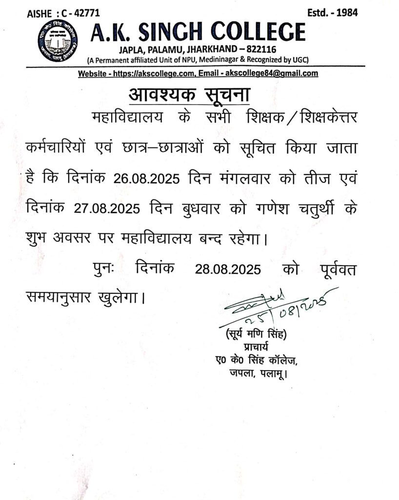अवकाश Post author:A K Singh College, Japla Post published:August 25, 2025 Post category:Uncategorized Post comments:0 Comments Share this:FacebookXLike this:Like Loading... You Might Also Like Quize Competition Notice December 25, 2024 गुरुजी स्टुडेंट क्रेडिट कार्ड योजना” November 29, 2023 EXAMINATION FORM FILLING-UP SCHEDULE SESSION 2020-23,SEMESTER-6 AND BACKLOG December 5, 2023 Leave a Reply Cancel replyCommentEnter your name or username to comment Enter your email address to comment Enter your website URL (optional) Save my name, email, and website in this browser for the next time I comment. Notify me of follow-up comments by email. Notify me of new posts by email. Δ