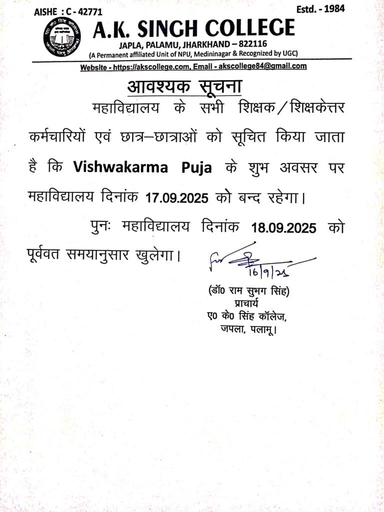 अवकाश Post author:A K Singh College, Japla Post published:September 16, 2025 Post category:Uncategorized Post comments:0 Comments Share this:FacebookXLike this:Like Loading... You Might Also Like Examination Form (Extended) 2023- 27, Sem- 2 March 22, 2025 अवकाश सूचना April 17, 2025 PRACTICAL EXAMINATION DATE FOR GEOGRAPHY August 22, 2021 Leave a Reply Cancel replyCommentEnter your name or username to comment Enter your email address to comment Enter your website URL (optional) Save my name, email, and website in this browser for the next time I comment. Notify me of follow-up comments by email. Notify me of new posts by email. Δ
