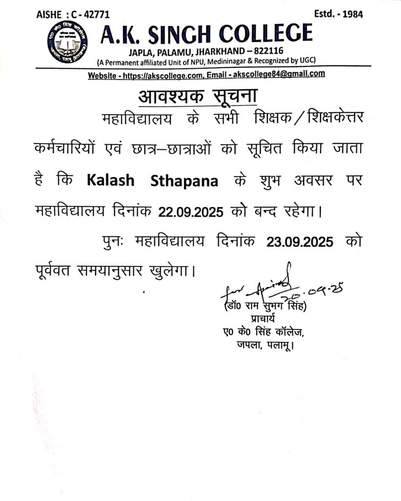 अवकाश Post author:A K Singh College, Japla Post published:September 20, 2025 Post category:Uncategorized Post comments:0 Comments Share this:FacebookXLike this:Like Loading... You Might Also Like PRACTICAL EXAMINATION DATE FOR HOME SCIENCE August 14, 2021 खेल सामग्री आपूर्ति हेतु कोटेसन November 28, 2021 Session 2023-27 Semester-3 Admission Notice October 25, 2024 Leave a Reply Cancel replyCommentEnter your name or username to comment Enter your email address to comment Enter your website URL (optional) Save my name, email, and website in this browser for the next time I comment. Notify me of follow-up comments by email. Notify me of new posts by email. Δ