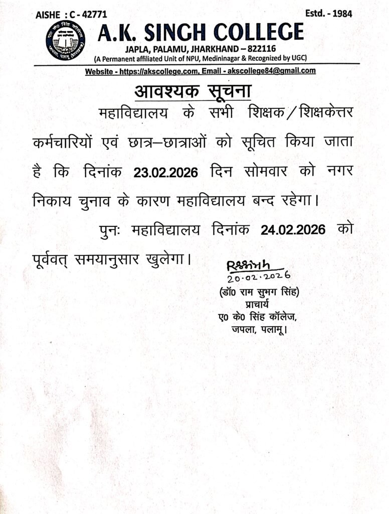 अवकाश Post author:A K Singh College, Japla Post published:February 22, 2026 Post category:Uncategorized Post comments:0 Comments Share this: Click to share on Facebook (Opens in new window) Facebook Click to share on X (Opens in new window) X Like this:Like Loading... You Might Also Like University Examination extended Form fill up schedule,sem-1, session 2022-26 June 23, 2023 NEW ADMISSION NOTICE SESSION -(2024-2028) May 30, 2024 अवकाश May 10, 2025 Leave a Reply Cancel replyCommentEnter your name or username to comment Enter your email address to comment Enter your website URL (optional) Save my name, email, and website in this browser for the next time I comment. Notify me of follow-up comments by email. Notify me of new posts by email. Δ
