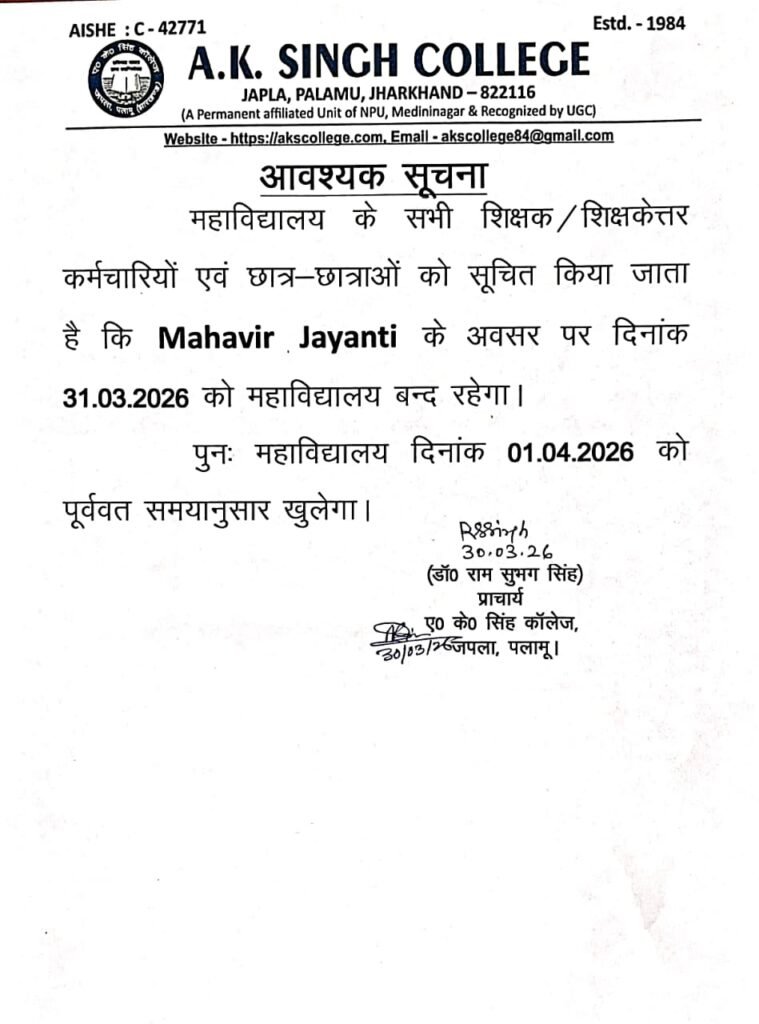 अवकाश Post author:A K Singh College, Japla Post published:March 30, 2026 Post category:Uncategorized Post comments:0 Comments Share this: Share on Facebook (Opens in new window) Facebook Share on X (Opens in new window) X Like this:Like Loading... You Might Also Like BACKLOG PRACTICAL EXAM(2018-21) SUBJECT-PHYSICS SEM-2 October 24, 2021 BACKLOG PRACTICAL EXAM(2018-21) SUBJECT-PSYCHOLOGY October 26, 2021 अवकाश February 22, 2026 Leave a Reply Cancel replyCommentEnter your name or username to comment Enter your email address to comment Enter your website URL (optional) Save my name, email, and website in this browser for the next time I comment. Notify me of follow-up comments by email. Notify me of new posts by email. Δ