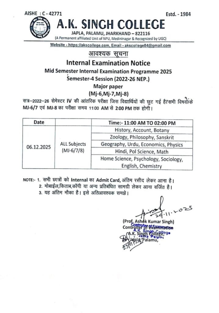 आंतरिक परीक्षा, सत्र 2022- 26, सेमेस्टर- 4 (छूटे हुए विद्यार्थियों के लिए) Post author:A K Singh College, Japla Post published:November 29, 2025 Post category:Uncategorized Post comments:0 Comments Share this: Click to share on Facebook (Opens in new window) Facebook Click to share on X (Opens in new window) X Like this:Like Loading... You Might Also Like Notice For Internal Form Filling schedule session- (2023-27) sem-1 & 2 January 10, 2024 परीक्षा फॉर्म सत्र 2024- 28 एवं 2023- 27 बैकलॉग January 29, 2026 प्रायोगिक परीक्षा (2022- 26) May 16, 2025 Leave a Reply Cancel replyCommentEnter your name or username to comment Enter your email address to comment Enter your website URL (optional) Save my name, email, and website in this browser for the next time I comment. Notify me of follow-up comments by email. Notify me of new posts by email. Δ