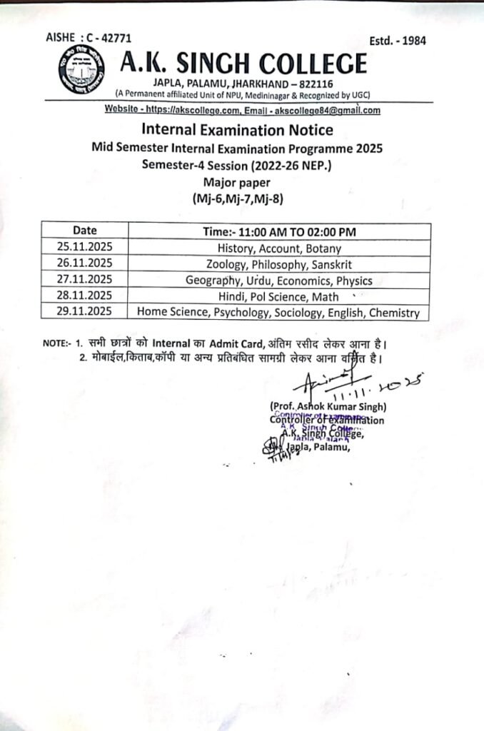 आंतरिक परीक्षा सेमेस्टर 4, सत्र 2022- 26 Post author:A K Singh College, Japla Post published:November 12, 2025 Post category:Uncategorized Post comments:0 Comments Share this: Click to share on Facebook (Opens in new window) Facebook Click to share on X (Opens in new window) X Like this:Like Loading... You Might Also Like Student Seminar January 18, 2025 INTERNAL EXAMINATION FORM FILLING SHEDULE,SEMESTER- 3 & 4, SESSION -2021-2024 April 29, 2023 अंकपत्र September 1, 2025 Leave a Reply Cancel replyCommentEnter your name or username to comment Enter your email address to comment Enter your website URL (optional) Save my name, email, and website in this browser for the next time I comment. Notify me of follow-up comments by email. Notify me of new posts by email. Δ