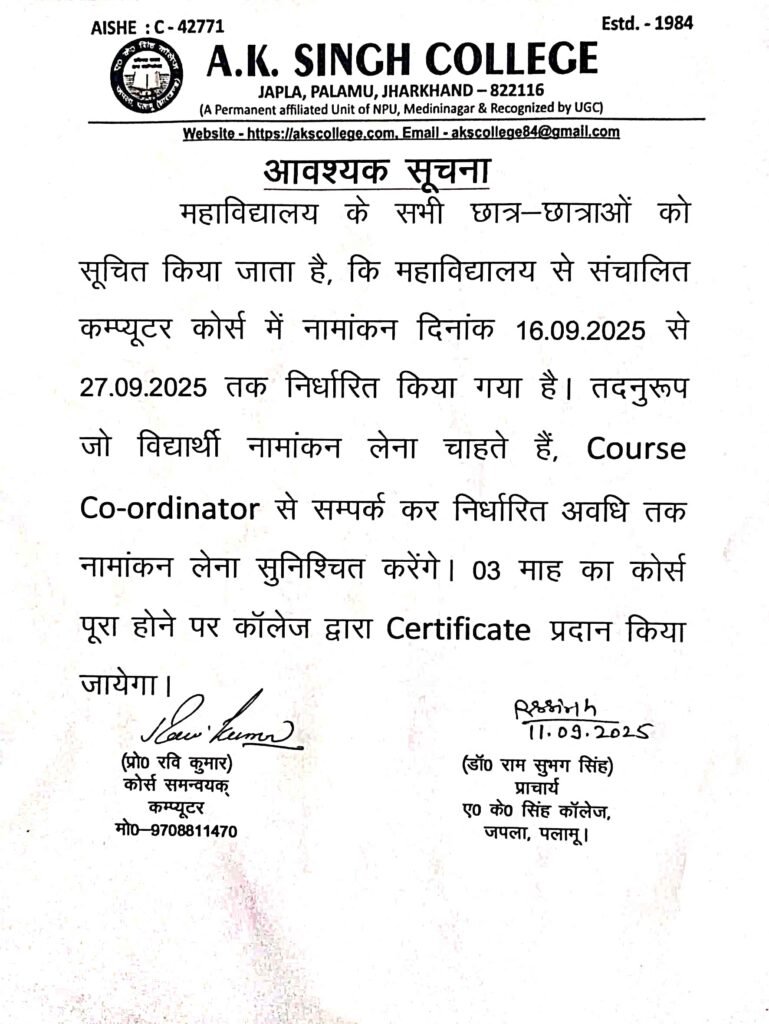 कंप्यूटर क्लास से संबंधित Post author:A K Singh College, Japla Post published:September 11, 2025 Post category:Uncategorized Post comments:0 Comments Share this:FacebookXLike this:Like Loading... You Might Also Like Scholarship Notice December 20, 2024 अवकाश June 6, 2025 Internal Examination Notice for Semester-5 and backlog Session 2021-24 May 30, 2024 Leave a Reply Cancel replyCommentEnter your name or username to comment Enter your email address to comment Enter your website URL (optional) Save my name, email, and website in this browser for the next time I comment. Notify me of follow-up comments by email. Notify me of new posts by email. Δ