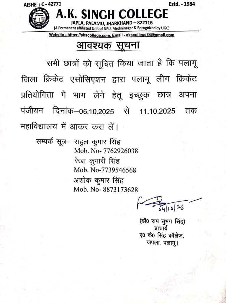 क्रिकेट संबंधी Post author:A K Singh College, Japla Post published:October 4, 2025 Post category:Uncategorized Post comments:0 Comments Share this:FacebookXLike this:Like Loading... You Might Also Like 2024-2028 New Admission Notice October 25, 2024 NSS Seminar April 9, 2025 Internal Examination Notice Session-(2021-24), Semester-5 December 17, 2024 Leave a Reply Cancel replyCommentEnter your name or username to comment Enter your email address to comment Enter your website URL (optional) Save my name, email, and website in this browser for the next time I comment. Notify me of follow-up comments by email. Notify me of new posts by email. Δ