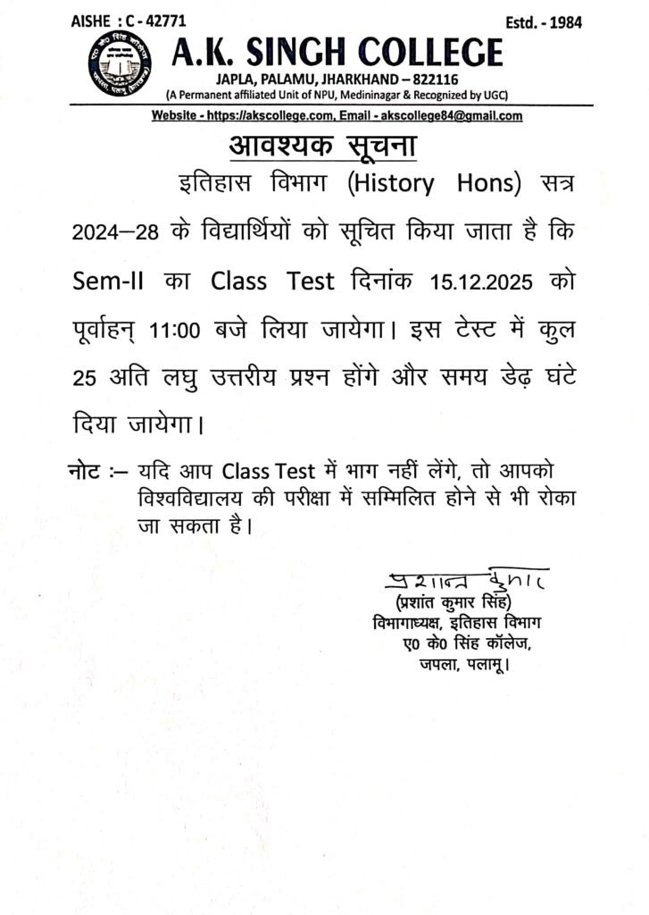 क्लास टेस्ट, सत्र 2024- 28 (Sociology & History)