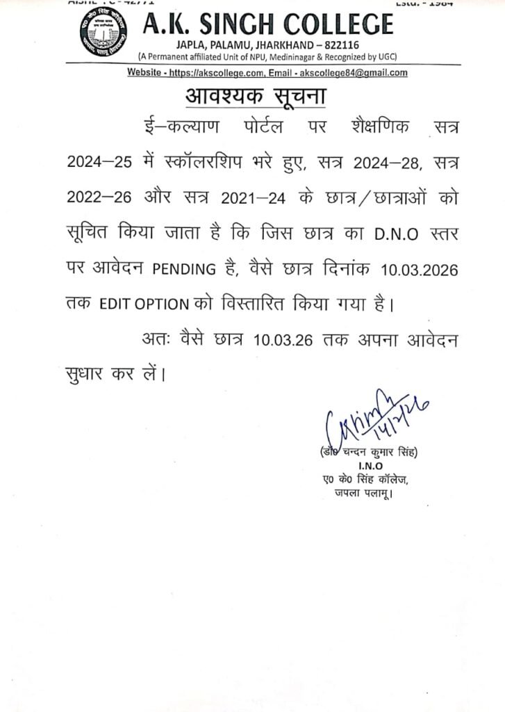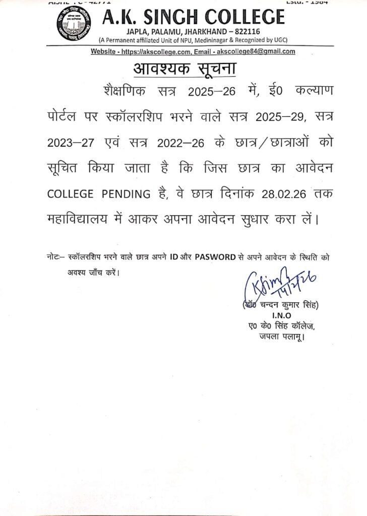 छात्रवृति सम्बन्धी Post author:A K Singh College, Japla Post published:February 14, 2026 Post category:Uncategorized Post comments:0 Comments Share this: Click to share on Facebook (Opens in new window) Facebook Click to share on X (Opens in new window) X Like this:Like Loading... You Might Also Like परीक्षा संबंधी, सेमेस्टर – 1, सत्र 2024-28 व बैकलॉग (2023- 27) July 16, 2025 प्रायोगिक परीक्षा, भूगोल विभाग (सत्र 2018- 21, 2019- 22, 2020- 23 एवं 2021- 24) December 6, 2025 प्रायोगिक परीक्षा, Botany (सत्र 2022- 26) बैकलॉग, सेमेस्टर 1&2 December 6, 2025 Leave a Reply Cancel replyCommentEnter your name or username to comment Enter your email address to comment Enter your website URL (optional) Save my name, email, and website in this browser for the next time I comment. Notify me of follow-up comments by email. Notify me of new posts by email. Δ
