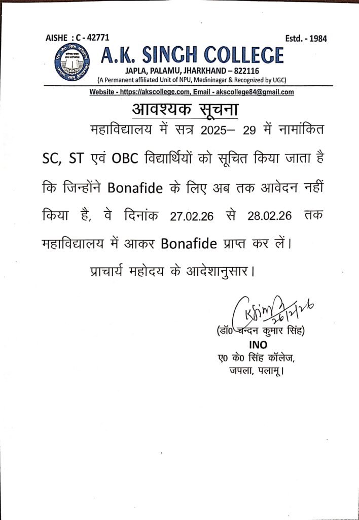 छात्रवृति सम्बन्धी Post author:A K Singh College, Japla Post published:February 27, 2026 Post category:Uncategorized Post comments:0 Comments Share this: Click to share on Facebook (Opens in new window) Facebook Click to share on X (Opens in new window) X Like this:Like Loading... You Might Also Like निबंध प्रतियोगिता December 13, 2025 EXAMINATION NOTICE FOR SESSION 2019-22 October 3, 2021 स्कॉलरशिप October 6, 2025 Leave a Reply Cancel replyCommentEnter your name or username to comment Enter your email address to comment Enter your website URL (optional) Save my name, email, and website in this browser for the next time I comment. Notify me of follow-up comments by email. Notify me of new posts by email. Δ