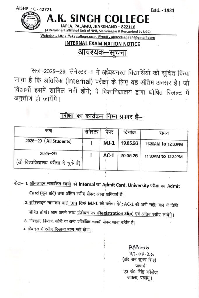 छूटे हुए आंतरिक परीक्षा संबंधी