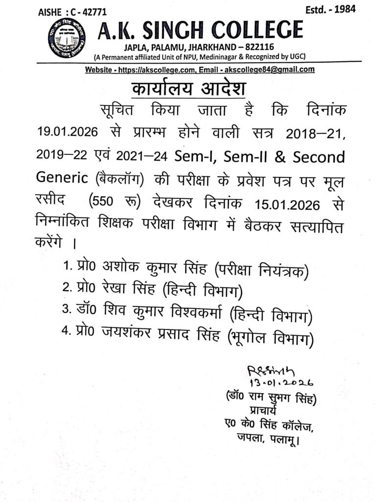प्रवेश पत्र सत्यापन Post author:A K Singh College, Japla Post published:January 13, 2026 Post category:Uncategorized Post comments:0 Comments Share this: Click to share on Facebook (Opens in new window) Facebook Click to share on X (Opens in new window) X Like this:Like Loading... You Might Also Like University Examination form filling schedule semester-1 session 2022-2026 May 23, 2023 अवकाश August 8, 2025 स्कॉलर शिप September 24, 2025 Leave a Reply Cancel replyCommentEnter your name or username to comment Enter your email address to comment Enter your website URL (optional) Save my name, email, and website in this browser for the next time I comment. Notify me of follow-up comments by email. Notify me of new posts by email. Δ