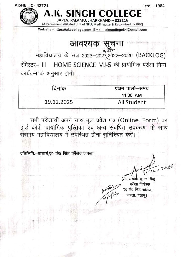 प्रायोगिक परीक्षा, गृह विज्ञान विभाग (सत्र 2022- 26, बैकलॉग & 2023- 27) Post author:A K Singh College, Japla Post published:December 11, 2025 Post category:Uncategorized Post comments:0 Comments Share this: Click to share on Facebook (Opens in new window) Facebook Click to share on X (Opens in new window) X Like this:Like Loading... You Might Also Like Library Routine April 4, 2025 BACKLOG PRACTICAL EXAM(2018-21) SUBJECT-PHYSICS SEM-1 October 24, 2021 अवकाश April 30, 2025 Leave a Reply Cancel replyCommentEnter your name or username to comment Enter your email address to comment Enter your website URL (optional) Save my name, email, and website in this browser for the next time I comment. Notify me of follow-up comments by email. Notify me of new posts by email. Δ