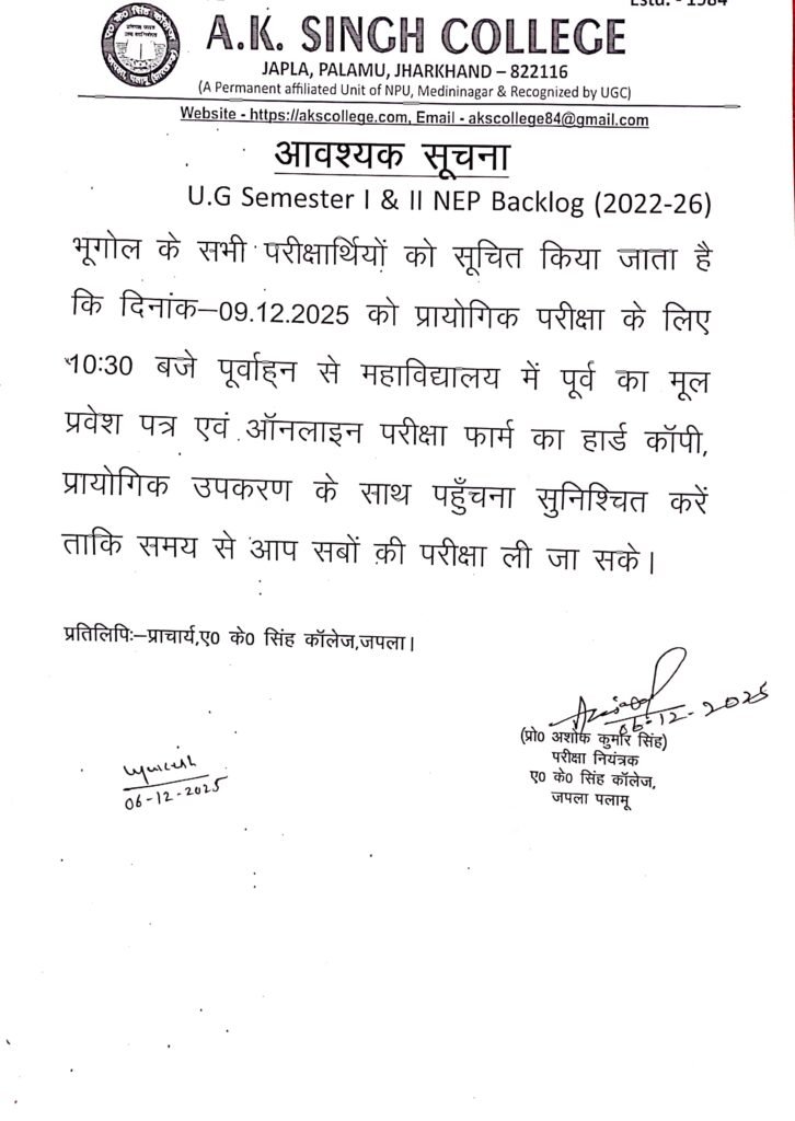 प्रायोगिक परीक्षा, भूगोल विभाग (सत्र 2022- 26) Post author:A K Singh College, Japla Post published:December 6, 2025 Post category:Uncategorized Post comments:0 Comments Share this: Click to share on Facebook (Opens in new window) Facebook Click to share on X (Opens in new window) X Like this:Like Loading... You Might Also Like I.Card Sambandhi April 4, 2025 Admission Notice, session-(2021-24) Semester-5, May 9, 2024 सत्र 2021- 24 एवं बैकलॉग, सेमेस्टर- 6 (कॉमर्स परीक्षार्थियों हेतु) June 26, 2025 Leave a Reply Cancel replyCommentEnter your name or username to comment Enter your email address to comment Enter your website URL (optional) Save my name, email, and website in this browser for the next time I comment. Notify me of follow-up comments by email. Notify me of new posts by email. Δ