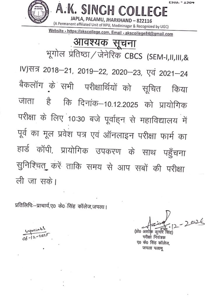 प्रायोगिक परीक्षा, भूगोल विभाग (सत्र 2018- 21, 2019- 22, 2020- 23 एवं 2021- 24) Post author:A K Singh College, Japla Post published:December 6, 2025 Post category:Uncategorized Post comments:0 Comments Share this: Click to share on Facebook (Opens in new window) Facebook Click to share on X (Opens in new window) X Like this:Like Loading... You Might Also Like सत्र 2021- 24, सेमेस्टर- 6 व बैकलॉग आंतरिक परीक्षा (संशोधित) May 27, 2025 NOTICE FOR PRACTICAL EXAMINATION SUBJECT-CHEMISTRY(2018-21) January 18, 2022 University Examination program NEP Semester-1 Session (2023-27) June 3, 2024 Leave a Reply Cancel replyCommentEnter your name or username to comment Enter your email address to comment Enter your website URL (optional) Save my name, email, and website in this browser for the next time I comment. Notify me of follow-up comments by email. Notify me of new posts by email. Δ