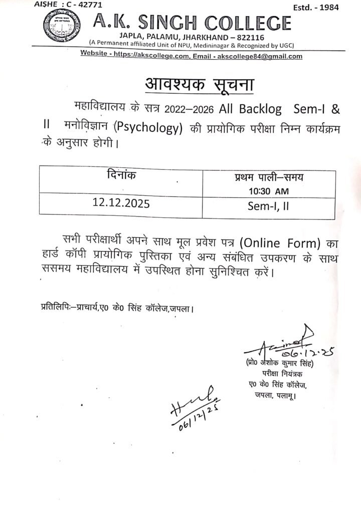 प्रायोगिक परीक्षा, मनोविज्ञान (सत्र 2022- 26 All बैकलॉग) सेमेस्टर 1&2 Post author:A K Singh College, Japla Post published:December 6, 2025 Post category:Uncategorized Post comments:0 Comments Share this: Click to share on Facebook (Opens in new window) Facebook Click to share on X (Opens in new window) X Like this:Like Loading... You Might Also Like University Examination form filling schedule semester-1 session 2022-2026 May 23, 2023 सेमेस्टर 3 नामांकन तिथि बढ़ाई गई November 14, 2025 NOTICE FOR PRACTICAL EXAMINATION SUBJECT-ZOOLOGY SEM-5 and 6 (2018-21) January 19, 2022 Leave a Reply Cancel replyCommentEnter your name or username to comment Enter your email address to comment Enter your website URL (optional) Save my name, email, and website in this browser for the next time I comment. Notify me of follow-up comments by email. Notify me of new posts by email. Δ