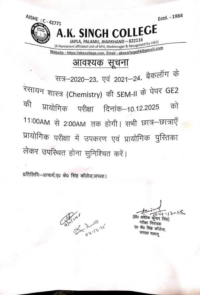 प्रायोगिक परीक्षा, रसायन शास्त्र (सत्र 2020- 23, एवं 2021- 24) Post author:A K Singh College, Japla Post published:December 6, 2025 Post category:Uncategorized Post comments:0 Comments Share this: Click to share on Facebook (Opens in new window) Facebook Click to share on X (Opens in new window) X Like this:Like Loading... You Might Also Like सेमिनार December 20, 2025 NOTICE FOR SESSION 2020-2023 October 31, 2021 Practical Notice Session-2020-23, Semester-5 Subject-Geography September 5, 2023 Leave a Reply Cancel replyCommentEnter your name or username to comment Enter your email address to comment Enter your website URL (optional) Save my name, email, and website in this browser for the next time I comment. Notify me of follow-up comments by email. Notify me of new posts by email. Δ
