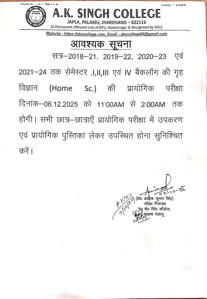 प्रायोगिक परीक्षा- सत्र 2018- 21, 2019- 22, 2020- 23 एवं 2021- 24, सेमेस्टर 1,2,3 एवं 4 बैकलॉग गृह विज्ञान Post author:A K Singh College, Japla Post published:December 2, 2025 Post category:Uncategorized Post comments:0 Comments Share this: Click to share on Facebook (Opens in new window) Facebook Click to share on X (Opens in new window) X Like this:Like Loading... You Might Also Like अवकाश August 15, 2025 Original marksheet distribution session 2019-2022 May 19, 2023 (2018-21) INTERNAL EXAM SEM-5 & SEM-6 December 7, 2021 Leave a Reply Cancel replyCommentEnter your name or username to comment Enter your email address to comment Enter your website URL (optional) Save my name, email, and website in this browser for the next time I comment. Notify me of follow-up comments by email. Notify me of new posts by email. Δ