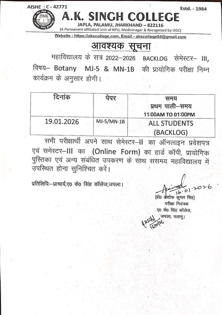 प्रायोगिक परीक्षा सत्र 2022- 26 बैकलॉग, सेमेस्टर 3 (Zoology & Botany) Post author:A K Singh College, Japla Post published:January 18, 2026 Post category:Uncategorized Post comments:0 Comments Share this: Click to share on Facebook (Opens in new window) Facebook Click to share on X (Opens in new window) X Like this:Like Loading... You Might Also Like प्रायोगिक परीक्षा, भौतिक शास्त्र (2021- 24, सेमेस्टर- 6) June 26, 2025 विकसित भारत यूथ पार्लियामेंट March 1, 2025 सत्र 2022- 26, सेमेस्टर- 3 प्रायोगिक परीक्षा (Zoology) May 20, 2025 Leave a Reply Cancel replyCommentEnter your name or username to comment Enter your email address to comment Enter your website URL (optional) Save my name, email, and website in this browser for the next time I comment. Notify me of follow-up comments by email. Notify me of new posts by email. Δ