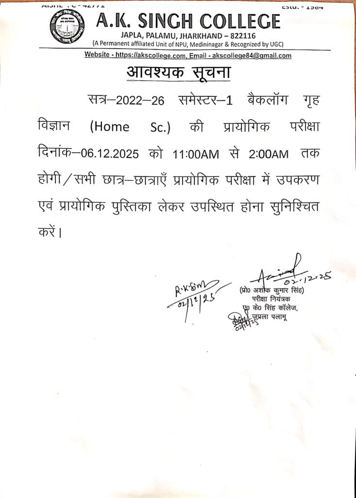 प्रायोगिक परीक्षा, सेमेस्टर- 1 बैकलॉग सत्र 2022- 26 (गृह विज्ञान) Post author:A K Singh College, Japla Post published:December 2, 2025 Post category:Uncategorized Post comments:0 Comments Share this: Click to share on Facebook (Opens in new window) Facebook Click to share on X (Opens in new window) X Like this:Like Loading... You Might Also Like NOTICE FOR SCHOLARSHIP September 21, 2021 Practical Notice session 2021-24, Semester-3 and Backlog,All Subject September 10, 2023 Student Seminar January 18, 2025 Leave a Reply Cancel replyCommentEnter your name or username to comment Enter your email address to comment Enter your website URL (optional) Save my name, email, and website in this browser for the next time I comment. Notify me of follow-up comments by email. Notify me of new posts by email. Δ