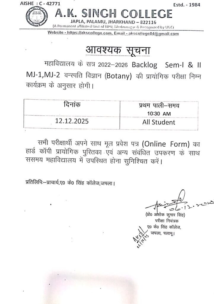 प्रायोगिक परीक्षा, Botany (सत्र 2022- 26) बैकलॉग, सेमेस्टर 1&2 Post author:A K Singh College, Japla Post published:December 6, 2025 Post category:Uncategorized Post comments:0 Comments Share this: Click to share on Facebook (Opens in new window) Facebook Click to share on X (Opens in new window) X Like this:Like Loading... You Might Also Like प्रायोगिक परीक्षा वनस्पति विज्ञान, सेमेस्टर- 1 & बैकलॉग (सत्र – 2024- 28) August 12, 2025 Examination Form Fill-up Schedule Session 2022-26, Semester-3 January 2, 2025 Admission Notice, session-(2021-24) Semester-5, May 9, 2024 Leave a Reply Cancel replyCommentEnter your name or username to comment Enter your email address to comment Enter your website URL (optional) Save my name, email, and website in this browser for the next time I comment. Notify me of follow-up comments by email. Notify me of new posts by email. Δ