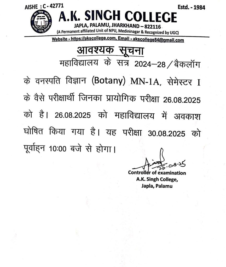 प्रायोगिक परीक्षा , Botany (2024- 28) Post author:A K Singh College, Japla Post published:August 25, 2025 Post category:Uncategorized Post comments:0 Comments Share this:FacebookXLike this:Like Loading... You Might Also Like Session-(2021-24), Semester-5 and Backlog Examination Programme notice November 29, 2024 I-Card संबंधी सूचना (सत्र – 2024- 28) March 8, 2025 National Sports Day Notice August 25, 2023 Leave a Reply Cancel replyCommentEnter your name or username to comment Enter your email address to comment Enter your website URL (optional) Save my name, email, and website in this browser for the next time I comment. Notify me of follow-up comments by email. Notify me of new posts by email. Δ