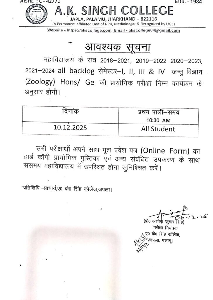 प्रायोगिक परीक्षा, Zoology (सत्र 2018- 21, 2019- 22, 2020- 23, एवं 2021- 24) सेमेस्टर 1,2,3&4 Post author:A K Singh College, Japla Post published:December 6, 2025 Post category:Uncategorized Post comments:0 Comments Share this: Click to share on Facebook (Opens in new window) Facebook Click to share on X (Opens in new window) X Like this:Like Loading... You Might Also Like नियुक्ति सम्बन्धी सूचना December 5, 2021 EXAMINATION FORM FILLING-UP SCHEDULE SESSION 2020-23,SEMESTER-6 AND BACKLOG December 5, 2023 EXAMINATION PROGRAMME SESSION-(2019-22)and(2018-21) SEMESTER-1 Second Generic subject December 8, 2023 Leave a Reply Cancel replyCommentEnter your name or username to comment Enter your email address to comment Enter your website URL (optional) Save my name, email, and website in this browser for the next time I comment. Notify me of follow-up comments by email. Notify me of new posts by email. Δ