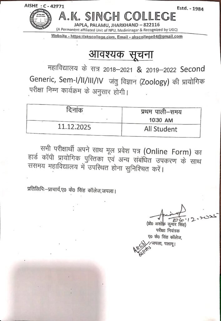 प्रायोगिक परीक्षा, Zoology (सत्र 2018- 21 एवं 2019- 22)