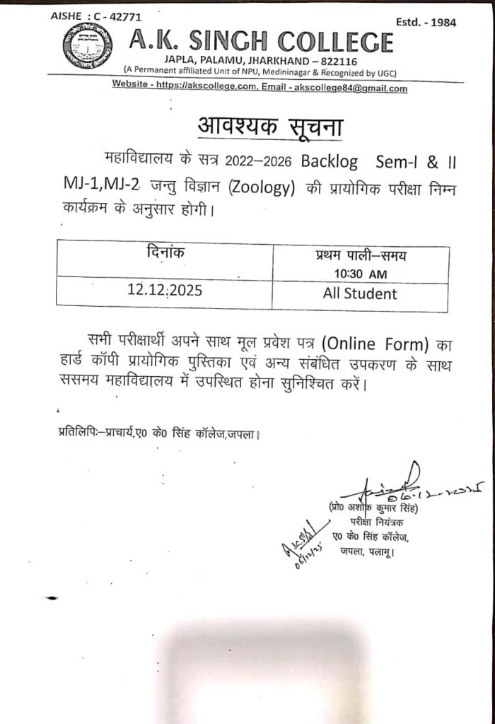 प्रायोगिक परीक्षा, Zoology (सत्र 2022- 26 बैकलॉग) सेमेस्टर 1&2 Post author:A K Singh College, Japla Post published:December 6, 2025 Post category:Uncategorized Post comments:0 Comments Share this: Click to share on Facebook (Opens in new window) Facebook Click to share on X (Opens in new window) X Like this:Like Loading... You Might Also Like प्रायोगिक परीक्षा (सत्र 2018- 21, 2019- 22) भूगोल विभाग December 6, 2025 Ek Rashtr Ek Chunaw se Samandhit Suchna March 11, 2025 NSS Seminar April 9, 2025 Leave a Reply Cancel replyCommentEnter your name or username to comment Enter your email address to comment Enter your website URL (optional) Save my name, email, and website in this browser for the next time I comment. Notify me of follow-up comments by email. Notify me of new posts by email. Δ