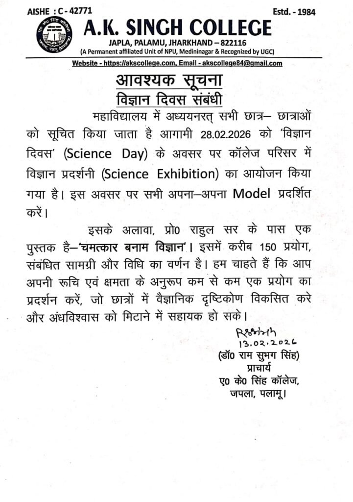 विज्ञान दिवस संबंधी Post author:A K Singh College, Japla Post published:February 13, 2026 Post category:Uncategorized Post comments:0 Comments Share this: Click to share on Facebook (Opens in new window) Facebook Click to share on X (Opens in new window) X Like this:Like Loading... You Might Also Like Internal Exam Programme November 27, 2021 Practical examination notice Session -(2022-2026), Semester -1,All Subject. July 18, 2023 Admit Card Notice for semester-1, session-(2022-2026) July 3, 2023 Leave a Reply Cancel replyCommentEnter your name or username to comment Enter your email address to comment Enter your website URL (optional) Save my name, email, and website in this browser for the next time I comment. Notify me of follow-up comments by email. Notify me of new posts by email. Δ