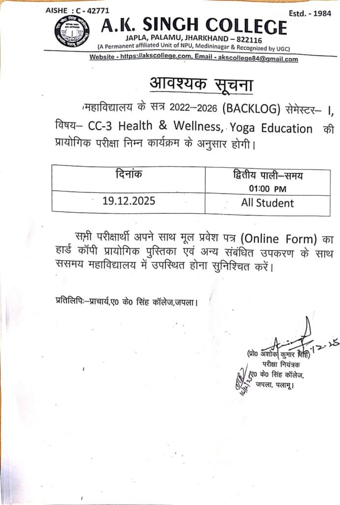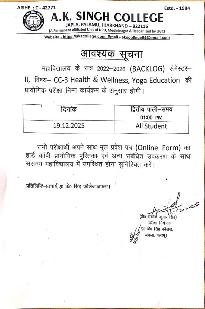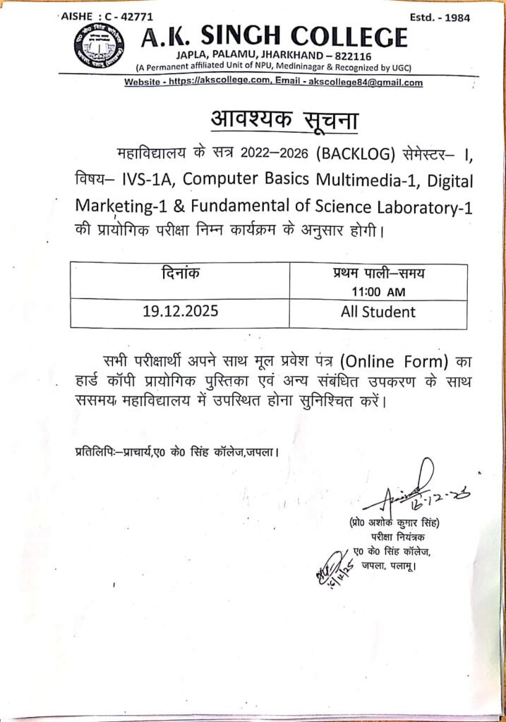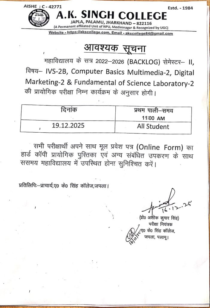 सत्र 2022- 26 & बैकलॉग परीक्षा Post author:A K Singh College, Japla Post published:December 17, 2025 Post category:Uncategorized Post comments:0 Comments Share this: Click to share on Facebook (Opens in new window) Facebook Click to share on X (Opens in new window) X Like this:Like Loading... You Might Also Like Internal Exam Programme UG Sem-V (2018-21) November 27, 2021 Session-(2021-24), Semester-5 and Backlog Examination notice November 20, 2024 प्रायोगिक परीक्षा2022- 26 बैकलॉग (2023- 27) Physics January 13, 2026 Leave a Reply Cancel replyCommentEnter your name or username to comment Enter your email address to comment Enter your website URL (optional) Save my name, email, and website in this browser for the next time I comment. Notify me of follow-up comments by email. Notify me of new posts by email. Δ