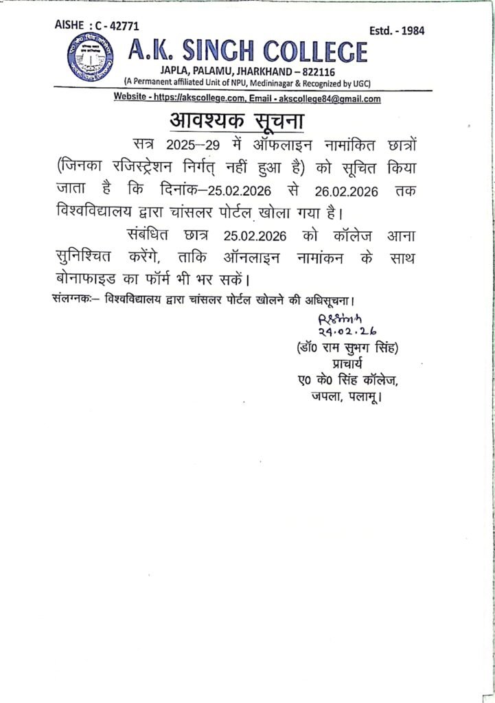 सत्र 2025- 29 में नामांकन संबंधी Post author:A K Singh College, Japla Post published:February 24, 2026 Post category:Uncategorized Post comments:0 Comments Share this: Click to share on Facebook (Opens in new window) Facebook Click to share on X (Opens in new window) X Like this:Like Loading... You Might Also Like Notice (Holiday) January 5, 2025 University examination notice January 15, 2024 अवकाश सूचना April 17, 2025 Leave a Reply Cancel replyCommentEnter your name or username to comment Enter your email address to comment Enter your website URL (optional) Save my name, email, and website in this browser for the next time I comment. Notify me of follow-up comments by email. Notify me of new posts by email. Δ