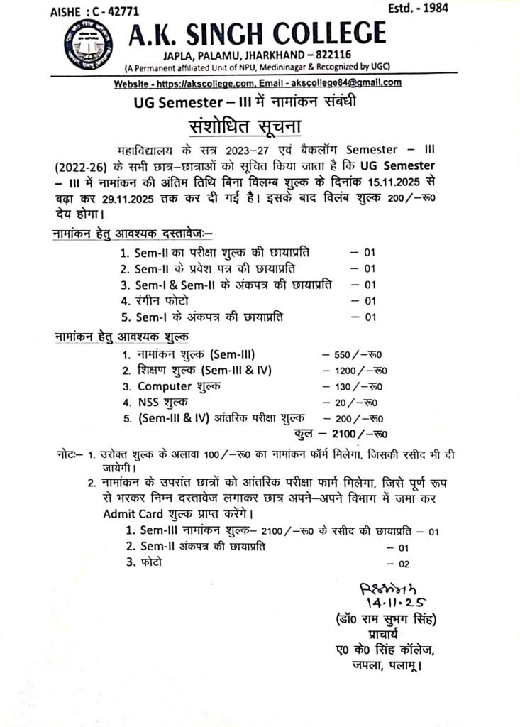 सेमेस्टर 3 नामांकन तिथि बढ़ाई गई Post author:A K Singh College, Japla Post published:November 14, 2025 Post category:Uncategorized Post comments:0 Comments Share this: Click to share on Facebook (Opens in new window) Facebook Click to share on X (Opens in new window) X Like this:Like Loading... You Might Also Like सेमेस्टर- 3 नामांकन, सत्र 2023- 27 एवं बैकलॉग (2022- 26) October 13, 2025 प्रायोगिक परीक्षा सत्र 2021- 24 एवं बैकलॉग, सेमेस्टर- 6 (Zoology) June 21, 2025 प्रायोगिक परीक्षा, रसायन (2022- 26) सेमेस्टर- 3 May 16, 2025 Leave a Reply Cancel replyCommentEnter your name or username to comment Enter your email address to comment Enter your website URL (optional) Save my name, email, and website in this browser for the next time I comment. Notify me of follow-up comments by email. Notify me of new posts by email. Δ