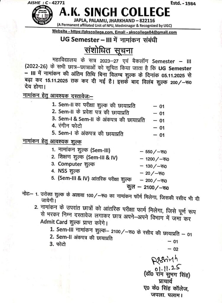 सेमेस्टर 3 में नामांकन अब 05 से बढ़ाकर 15.11.25 तक
