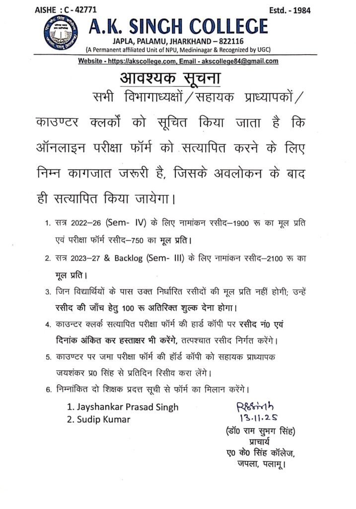 परीक्षा फॉर्म संबंधी हार्डकॉपी जमा करने के लिए मार्गदर्शन Post author:A K Singh College, Japla Post published:November 13, 2025 Post category:Uncategorized Post comments:0 Comments Share this: Click to share on Facebook (Opens in new window) Facebook Click to share on X (Opens in new window) X Like this:Like Loading... You Might Also Like University Examination program semester-3 Second Generic (CBCS) June 3, 2024 Notice For Seminar May 20, 2024 GEOGRAPHY PRACTICAL EXAMINATION BACKLOG SEM1,SEM 2 (2018-21) October 20, 2021 Leave a Reply Cancel replyCommentEnter your name or username to comment Enter your email address to comment Enter your website URL (optional) Save my name, email, and website in this browser for the next time I comment. Notify me of follow-up comments by email. Notify me of new posts by email. Δ